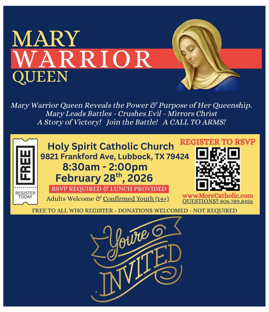 LUBBOCK, TX — February 28th, 2026— Prepare for a spiritual awakening like no other. “Mary Warrior Queen”, a powerful one-day Catholic Conference, is set to take place on Saturday, February 28th, 2026, from 8:30 AM to 2:00 PM, at Holy Spirit Catholic Church, 9821 Frankford Ave, Lubbock, Texas 79424.